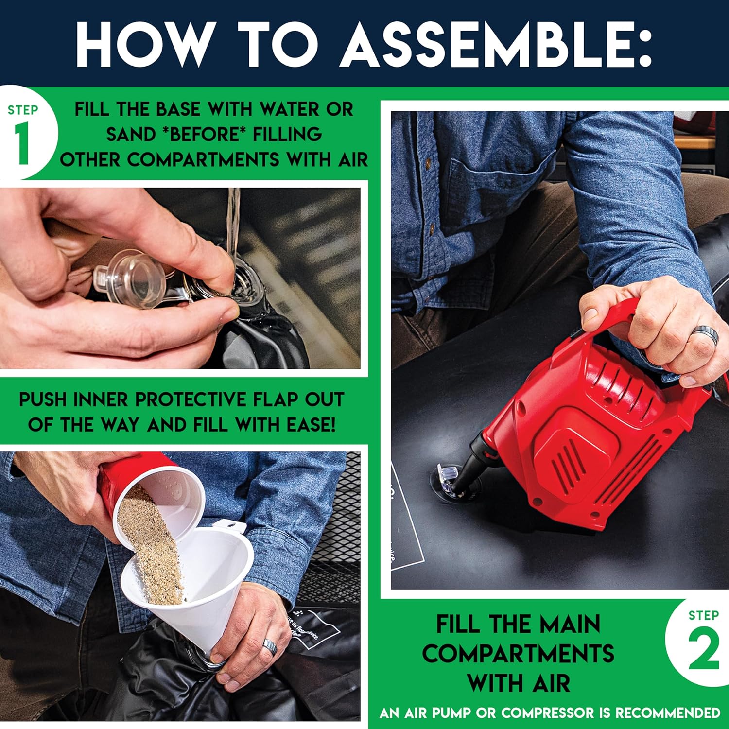 SET INCLUDES: (1) 45” inflatable 3-hole football target with water-fillable base, (2) 7.25” rotationally molded PVC footballs, (1) sports ball hand air pump with needle
