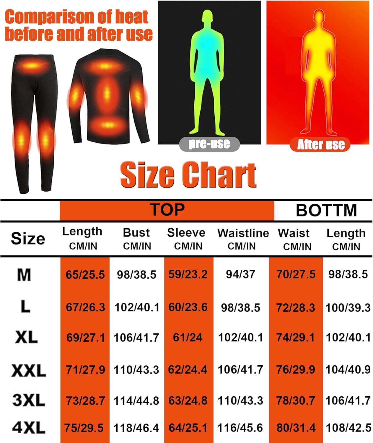 Men’s Electric Heated thermal underwear with 16 carbon fiber heating elements, Shoulder, Back, Waist, Elbow, Axillary, Abdomen, Knee, Buttock, Legs, wider heating area, balanced heating. 15s start heating, immediately make you feel warm!