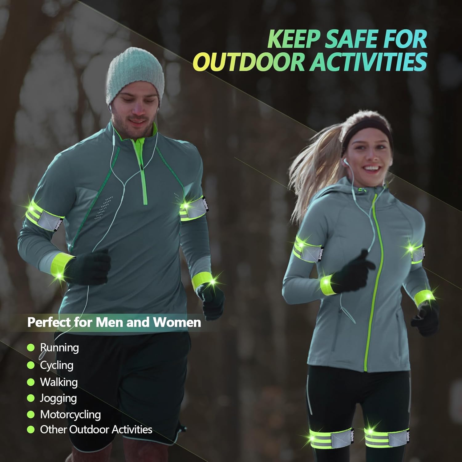 The Xeiophoy bands what wear on your Arm/Wrist/Ankle/Leg makes you look brighter, can be seen far away. meanwhile keep you safe in all weather conditions(rain, fog, dark) at day or night.